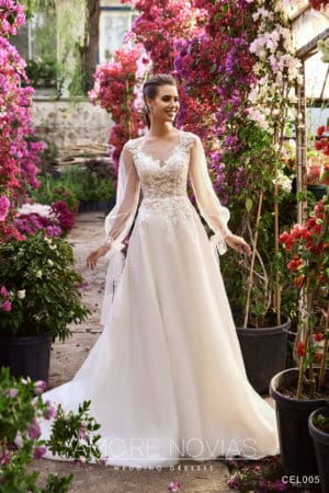Exquisite dress for the wedding ceremony and the sacrament of the wedding. The long-sleeved conservative cut is accented with a deep V-neckline. The sleeves are decorated with fine lace with geometric patterns. The material is a rich mikado fabric with a dense fiber texture and a soft aristocratic sheen. The inner corset is tightened with lacing, the upper beacon with long sleeves is supplemented with a row of buttons with loops. The lower part is lush, with a magnificent train.